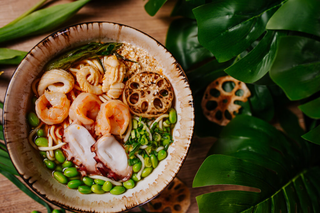Bulion shoyu-yuzu, krewetki, kalmar, ośmiornica, pak choi, edamame, lotos, chili, szczypior, sezam, makaron ramen
