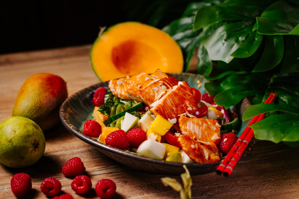 mix sałat, łosoś grillowany, owoce sezonowe, pomidorki koktailowe, ogórek, płatki migdałów, sos teriyaki -malina