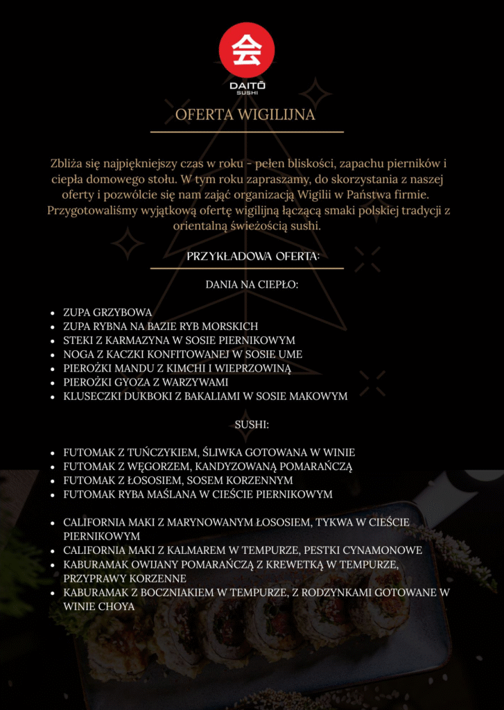Zbliża się najpiękniejszy czas w roku – pełen bliskości, zapachu pierników i ciepła wspólnego stołu. W tym wyjątkowym okresie zapraszamy do skorzystania z oferty wigilijnej Daito Sushi, stworzonej z myślą o firmach i zespołach, które chcą spędzić ten czas w wyjątkowej atmosferze.
