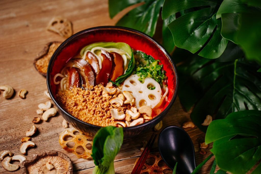 Bulion shoyu-yuzu, krewetki, kalmar, ośmiornica, pak choi, edamame, lotos, chili, szczypior, sezam, makaron ramen